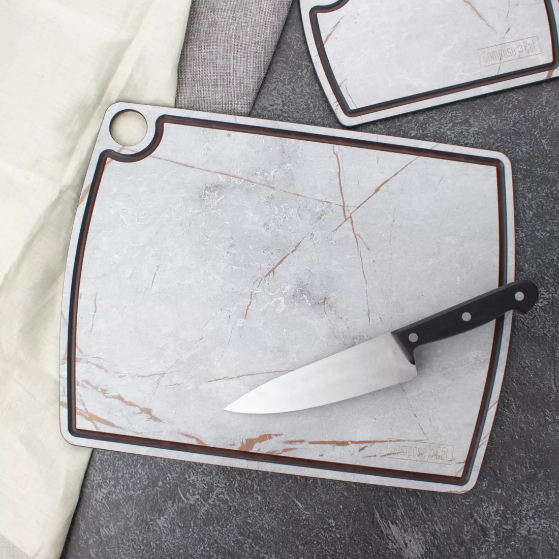 Само название бренда Compose Eat говорит о ключевом направлении деятельности компании. Ею был разработан уникальный композитный материал, в основе которого лежат слои крафтовой и декоративной бумаги, пропитанные экологически чистыми термопластичными смолами. В результате интенсивного влияния пресса материал приобретает невероятную степень плотности и прочности. Из цельных листов вырезаются заготовки досок, которые шлифуются, обрабатываются и тестируются на качество. Канавки по линии каемки, а также символика бренда вырезается лазером.