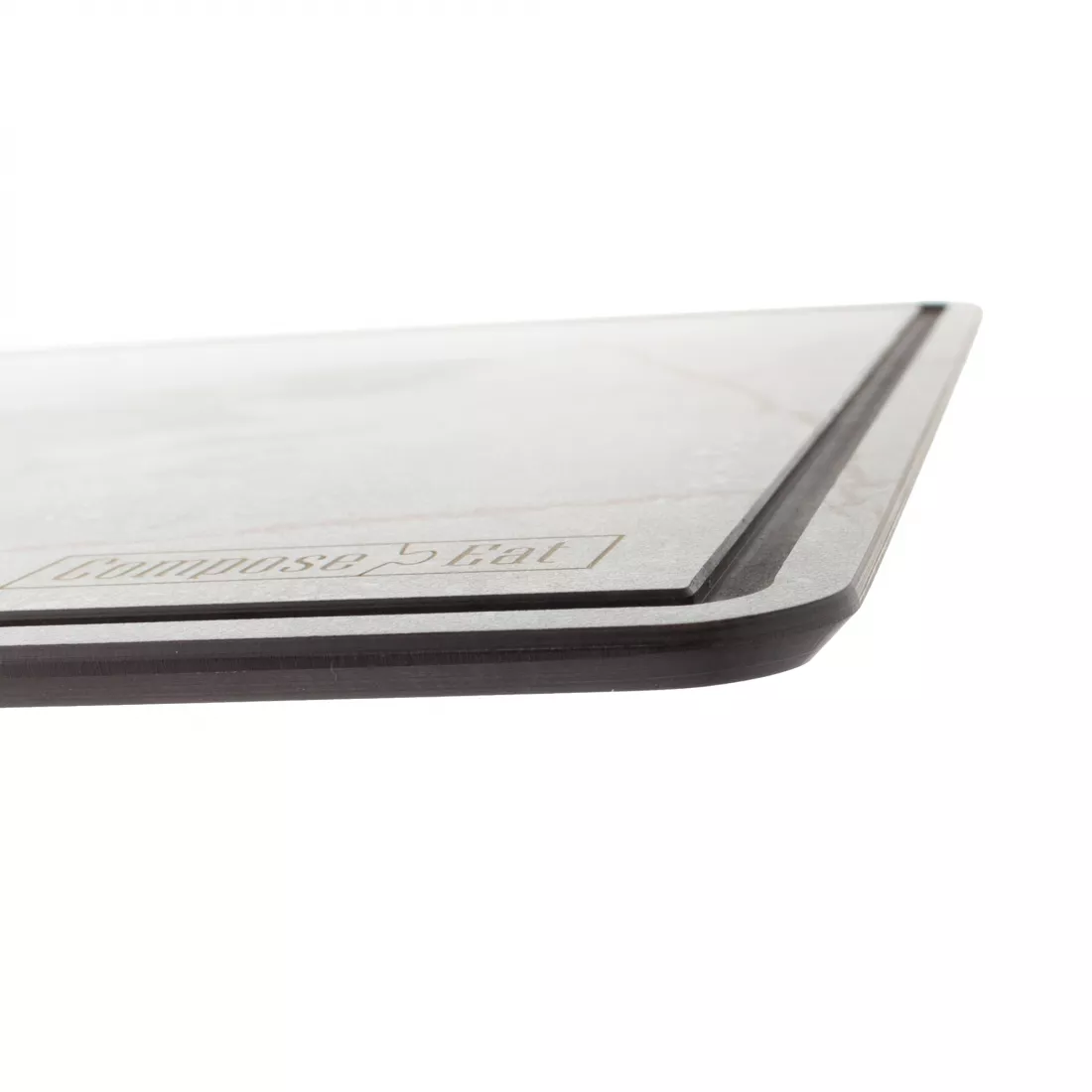 Само название бренда Compose Eat говорит о ключевом направлении деятельности компании. Ею был разработан уникальный композитный материал, в основе которого лежат слои крафтовой и декоративной бумаги, пропитанные экологически чистыми термопластичными смолами. В результате интенсивного влияния пресса материал приобретает невероятную степень плотности и прочности. Из цельных листов вырезаются заготовки досок, которые шлифуются, обрабатываются и тестируются на качество. Канавки по линии каемки, а также символика бренда вырезается лазером.