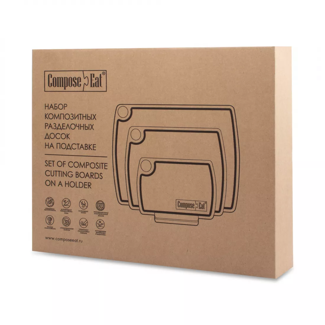 Разделочные доски Compose Eat из представленных в этом разделе наборов не требуют особых условий в содержании и хранении и очищаются от загрязнений как вручную, так и при щадящем режиме работы посудомоечной машины.