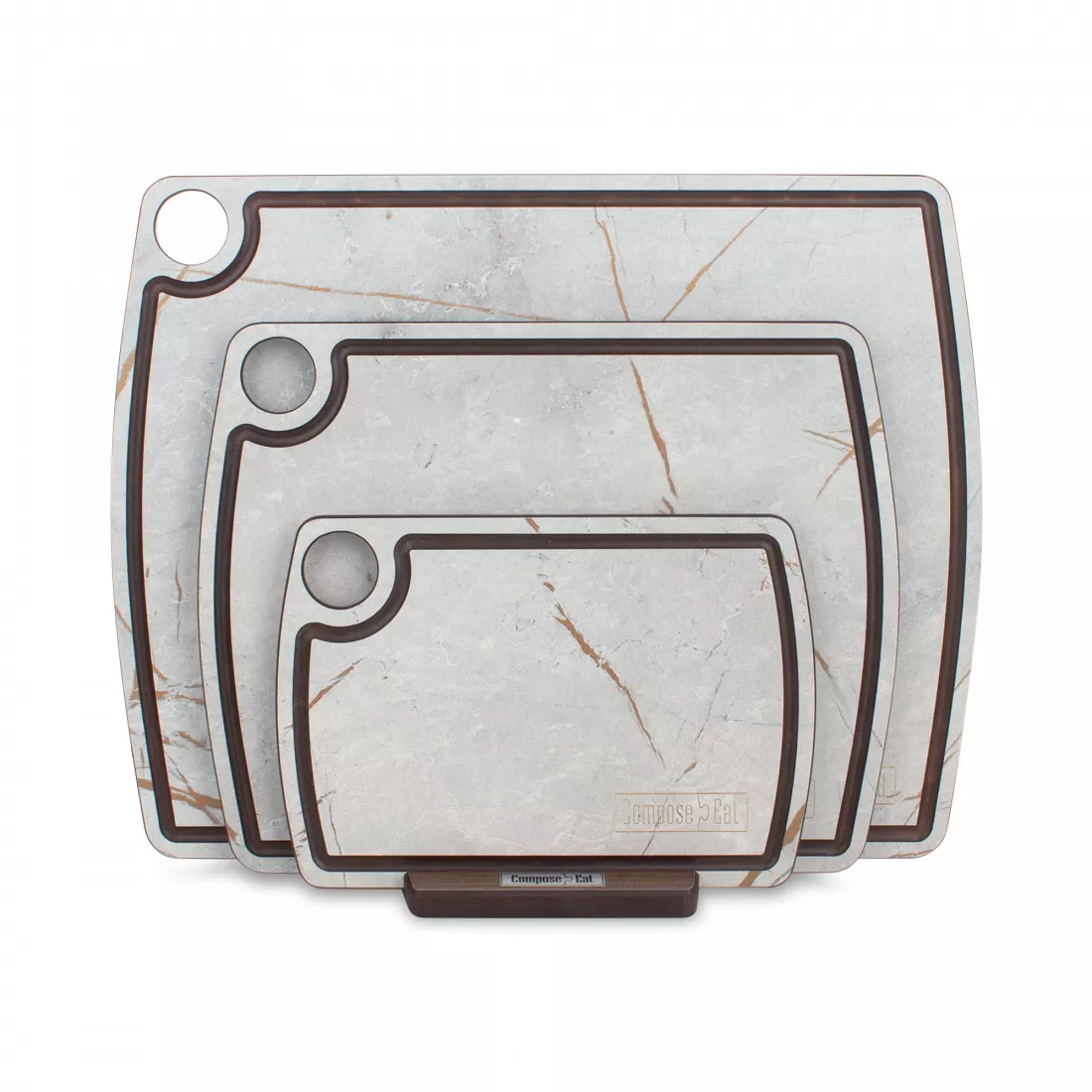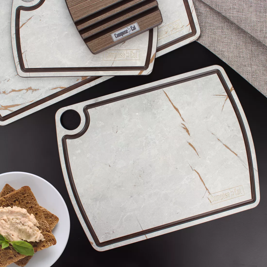 В качестве декора входящих в наборы разделочные доски от Compose Eat мастера бренда используют текстуру и расцветку материалов природного происхождения: натуральной древесины дуба, ореха, зебрано и прочих растений, а также мрамора, травертина, порфира и других горных пород. Дизайнеры максимально точно передают не только цвет, но и текстуру прототипа, благодаря чему доски потрясающе выглядят.