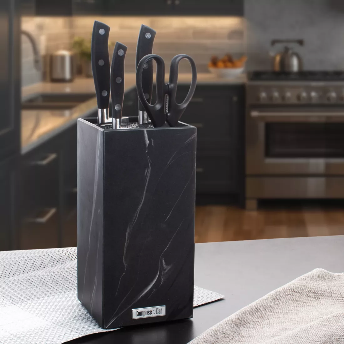 Изделия из серии Fashion от Compose Eat отличаются от прочей продукции бренда рядом функциональных дополнений. Некоторые модели досок оснащаются нескользящими силиконовыми ножками, а внутри подставок для ножей располагаются тонкие силиконовые стержни, служащие отличным способом удержания поварских инструментов в вертикальном положении. Коллекция включает в себя предметы, внешний вид и текстура которых максимально приближена к материалам натурального происхождения: древесине, мрамору, шунгиту и прочим.