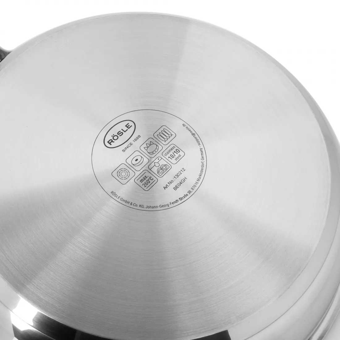 В основе большинства сковород Roesle лежит прочная износостойкая нержавеющая сталь. Этот материал универсален и подходит для изготовления любой модели. Он максимально быстро нагревается и также быстро остывает, а также легко выдерживает длительное воздействие высокой температуры. Кроме того, сталь содержит в своем составе легирующие элементы, значительно повышающее ее прочность и износостойкость. Также они гарантируют повышенную степень устойчивости изделий к влиянию агрессивных коррозийных факторов, не ржавеют и не деформируются. Сковороды можно мыть в посудомоечной машине и сушить в обычных условиях.